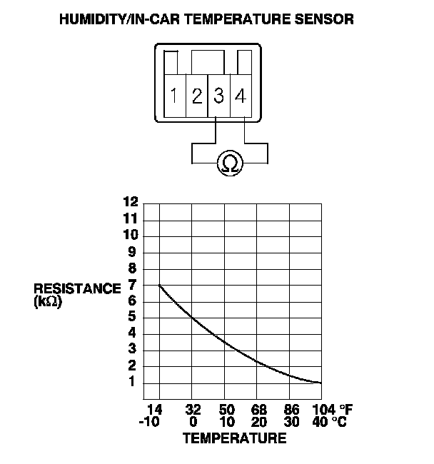 3. Compare the resistance reading between terminals No. 4 and No. 3 of the humidity/in-car temperature sensor with the specifications shown in the graph; the resistance should be within the specifications.
