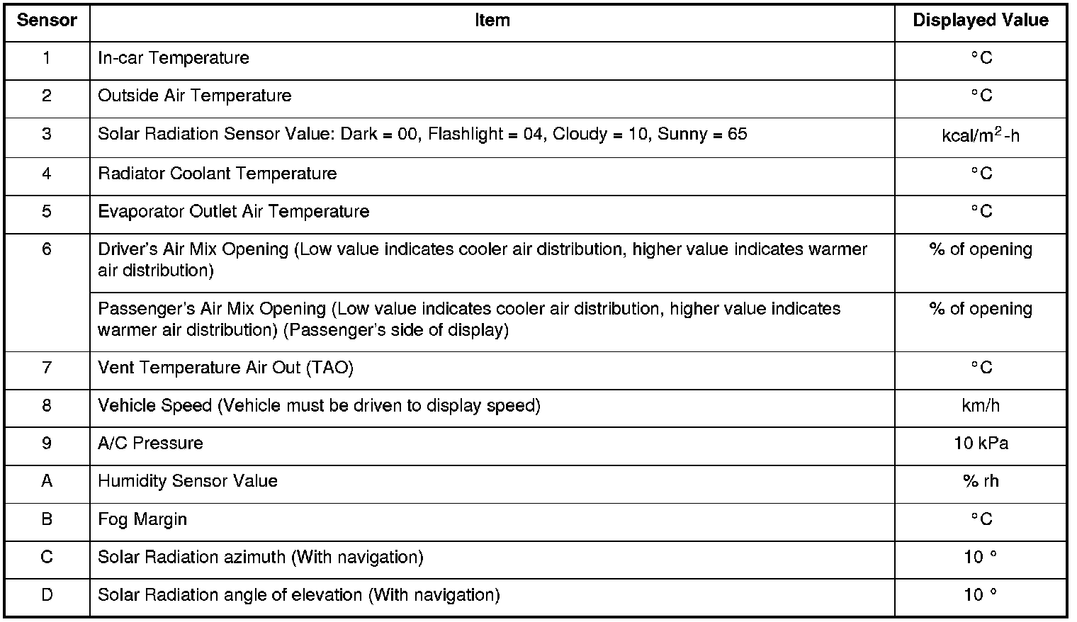 The climate control unit has a mode that displays the sensor inputs it receives. This mode shows you what the climate control unit is receiving from each of the sensors, one at a time, and it can help you determine if a sensor is faulty.