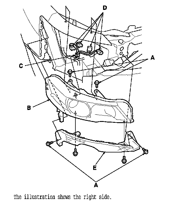 5. Remove the headlight with the corner upper beam (E).