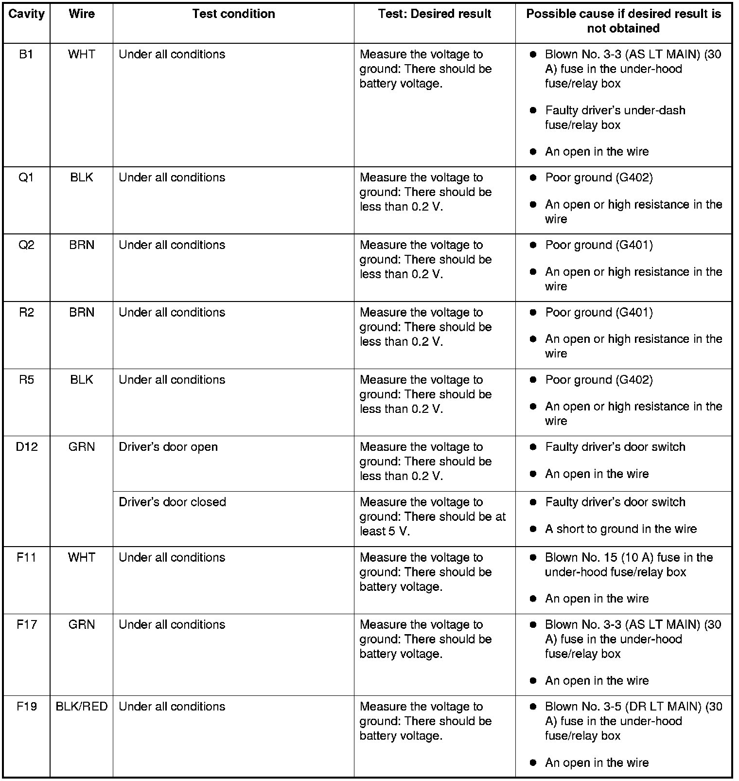 - Before testing, make sure the No. 12 (7.5 A), No. 15 (10 A), No. 26 (10 A), No. 27 (10 A), No. 28 (10 A), and No. 30 (10 A) fuse in the driver's under-dash fuse/relay box, and No. 1 (10 A), No. 2 (10 A), No. 3 (10 A), and No. 4 (10 A) fuse in the passenger's under-dash fuse/relay box is OK.