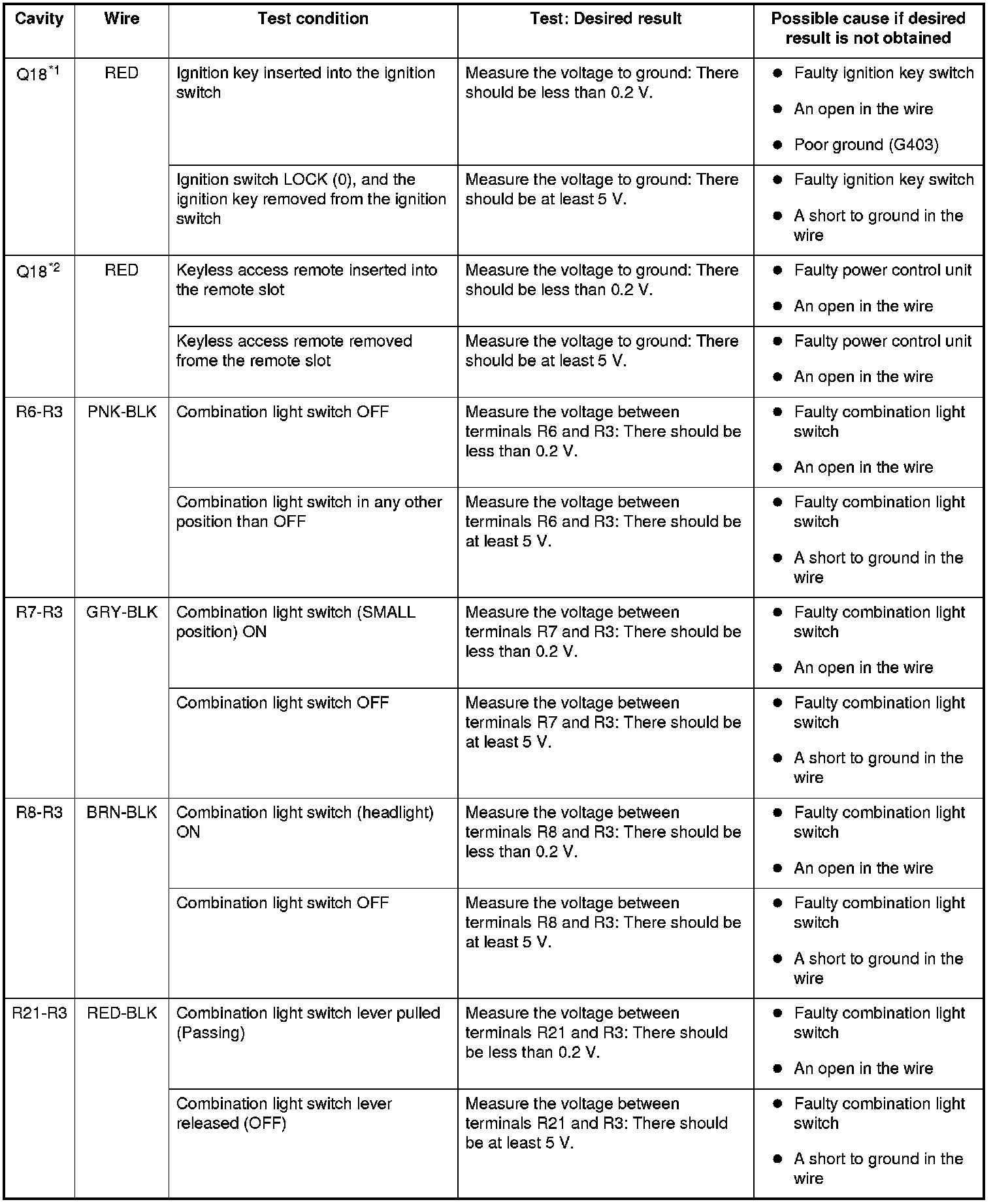 11. Reconnect the connectors to the passenger's under-dash fuse/relay box, turn the ignition switch to ON (II), or press the engine start/stop button to select the ON mode, and do these input tests at the following connectors.