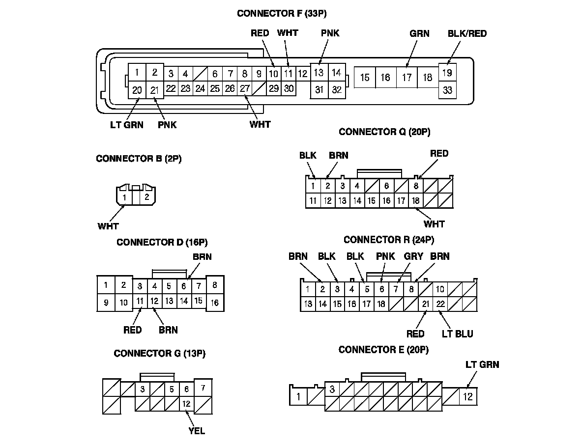 3. Disconnect driver's under-dash fuse/relay box connectors B, D, E, F, G, Q, and R.
