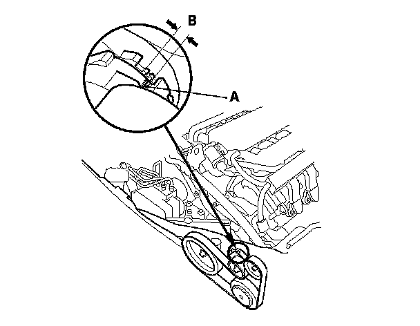 3. Check that the position of the auto-tensioner indicator (A) is within the standard range (B) as shown. If it is out of the standard range, replace the drive belt. Service and Repair