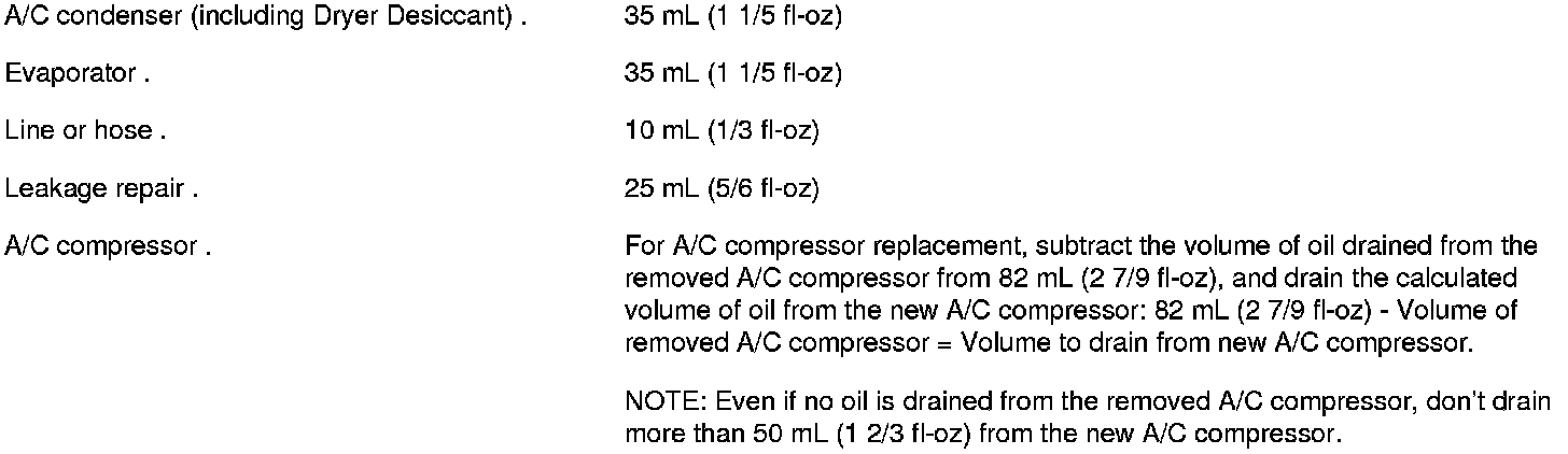 It is important to have the correct amount of refrigerant oil in the A/C system to ensure proper lubrication of the compressor. Too little oil damages the compressor; too much oil reduces the cooling capacity of the system, and can produce high vent temperatures.