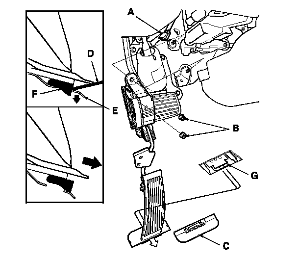 3. Remove the two mounting nuts (B), then remove the clip (C). Using a flat-tip screwdriver (D), push the lock (E), then remove the accelerator pedal pad (F) from the pedal stop (G).