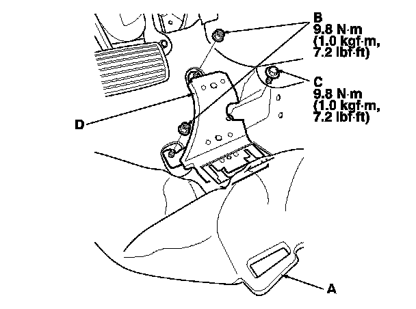 - If the pedal stop is damaged, replace it by pulling back the carpet (A), and removing the nuts (B), the bolt (C), and the pedal stop (D).