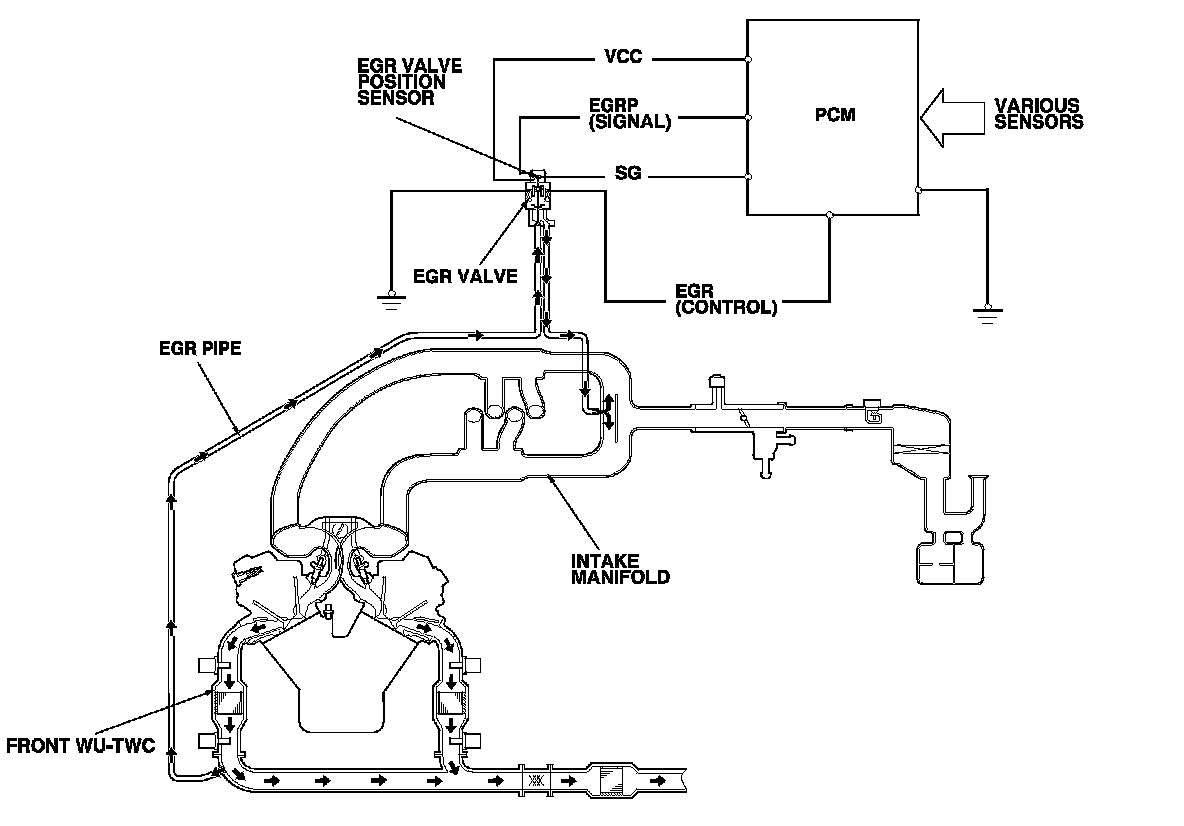 The EGR system reduces oxides of nitrogen (NOx) emissions by recirculating exhaust gas through the EGR pipe to the intake manifold, and into the combustion chambers. Routing the exhaust gas through the EGR pipe helps to prevent carbon deposits from forming in the intake manifold and the throttle body. The PCM memory includes the ideal EGR valve position for varying operating conditions.