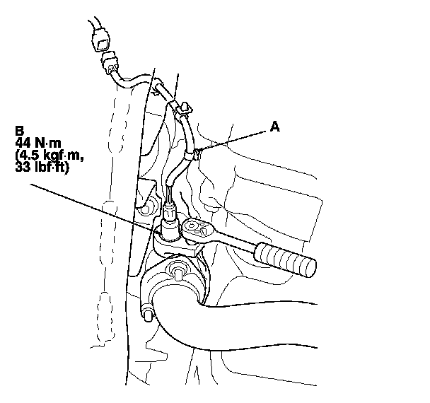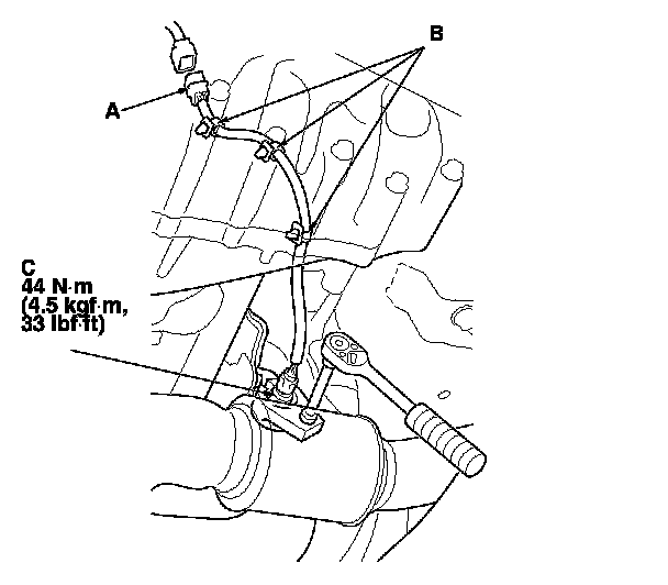 1. Disconnect the front secondary HO2S 4P connector (A), and remove the harness clamps (B).