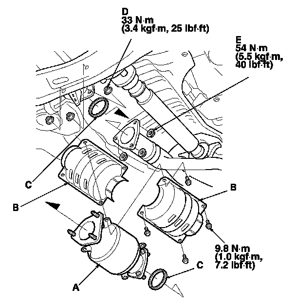 5. Install the parts in the reverse order of removal with new gaskets (C) and new self-locking nuts (D) and (E).