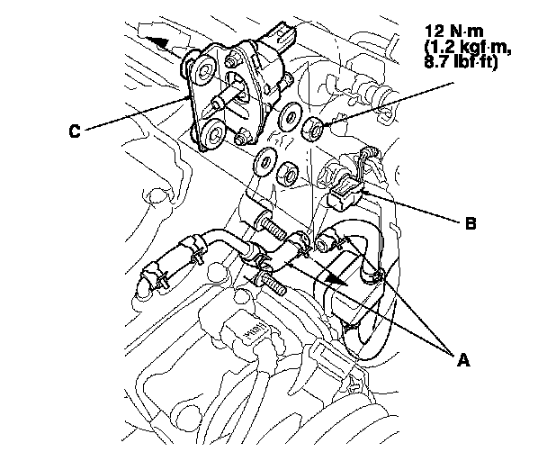 1. Disconnect the hoses (A) and the EVAP canister purge valve 2P connector (B).