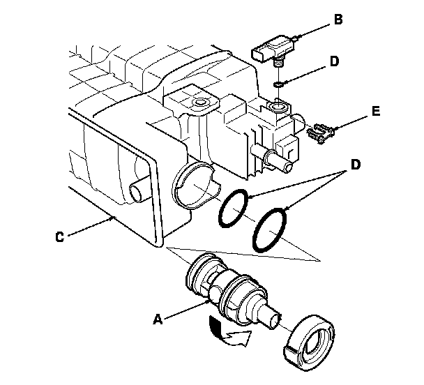 8. Reassemble the EVAP canister with new O-rings (D) and a new retainer (E), then install the EVAP canister bracket.