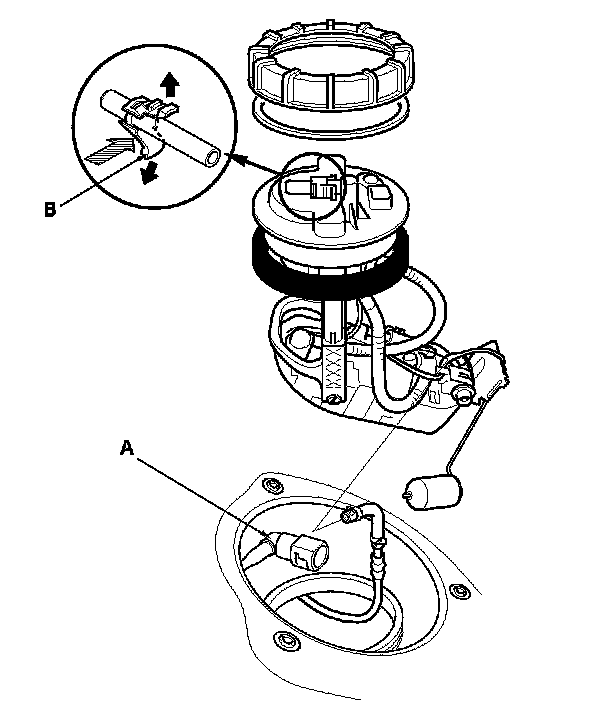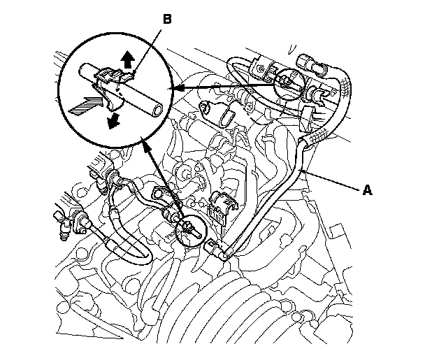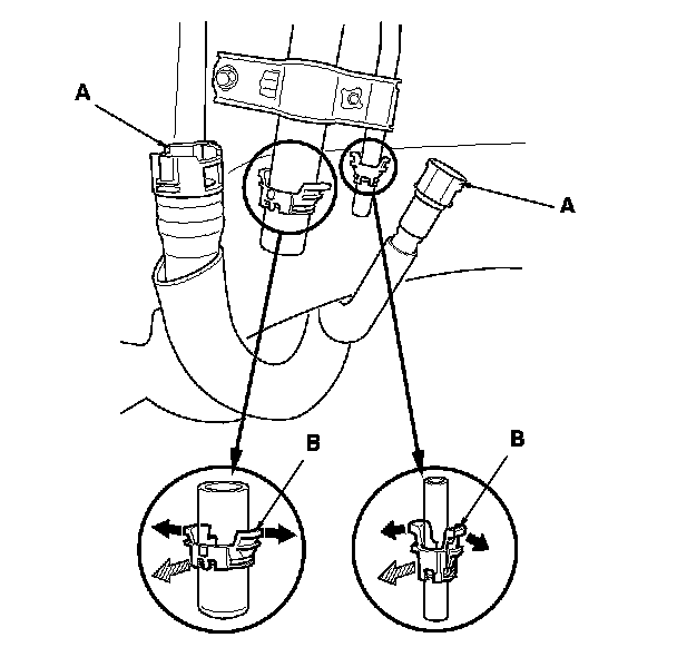 3. Before connecting a new fuel line/quick-connect fitting assembly (A), remove the old retainer (B) from the mating line.