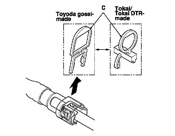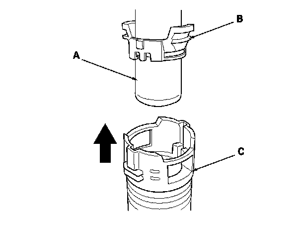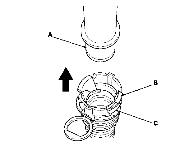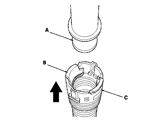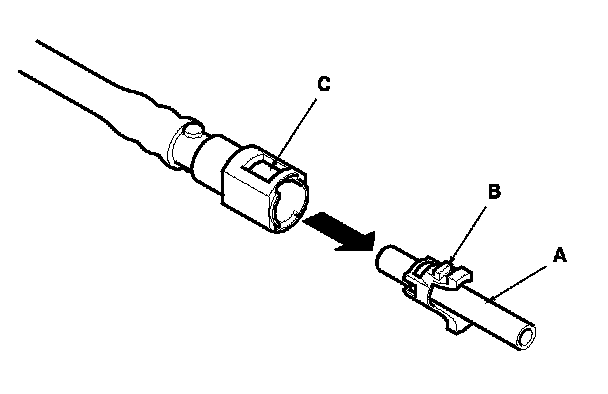 5. When you reconnect the connector with the old retainer, make sure the connection is secure and the tabs (A) are firmly locked into place; check visually and also by pulling the connector (B). When you replace the fuel line with a new one, make sure you remove the ring pull (C) upwards after you confirm the connection is secure.