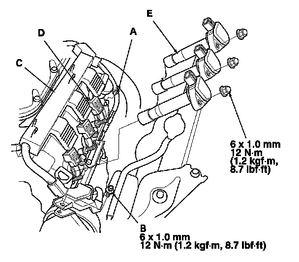 3. Disconnect the ignition coil connectors (D), then remove the front ignition coils (E).
