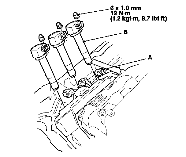 3. Disconnect the ignition coil connectors (A), then remove the rear ignition coils (B).