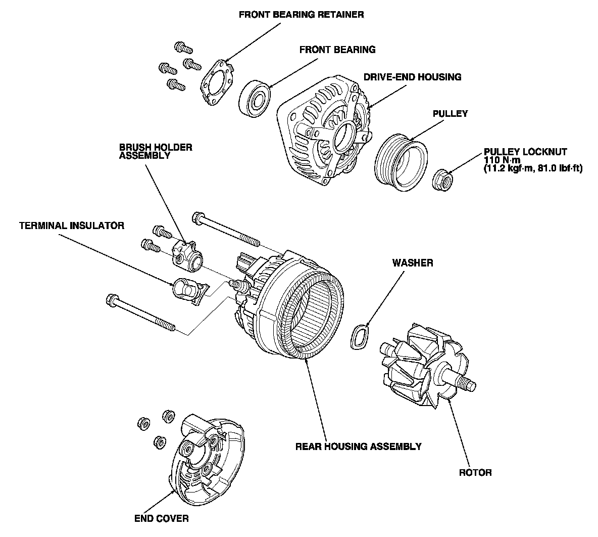 16. If you removed the pulley, put the rotor in the drive-end housing, then tighten its locknut to 110 N-m (11.2 kgf-m, 81.0 lbf-ft).