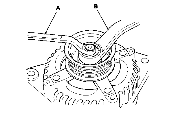 3. If the front bearing needs replacing, remove the pulley locknut with a 10 mm wrench (A) and a 22 mm wrench (B). If necessary, use an impact wrench.