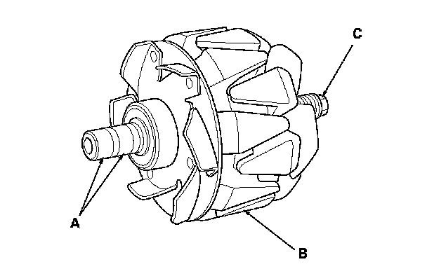 15. Check for continuity between each slip ring and the rotor (B) and the rotor shaft (C).