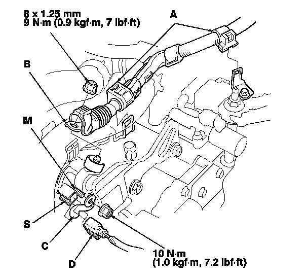 4. Remove the harness clamps (A), then disconnect the positive starter cable (B), the motor wire (C), and the S terminal connector (D).