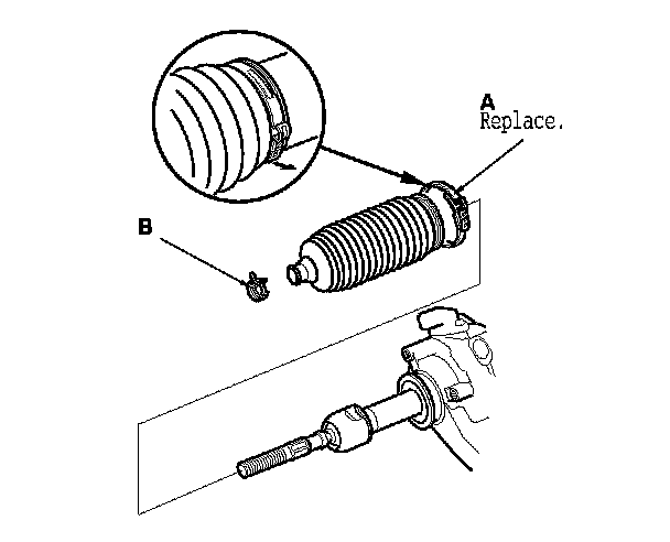 1. Remove the boot bands (A), and discard them. Remove the tie-rod clips (B), and pull the boots away from the ends of the steering gearbox.
