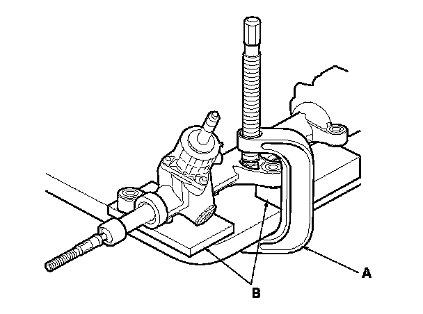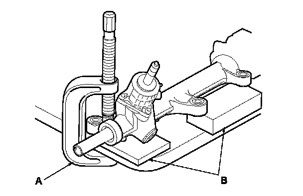 1. Hold the gearbox housing using a C-clamp (A) and wooden blocks (B) as shown. Do not clamp the cylinder part of the gearbox housing in the vise.
