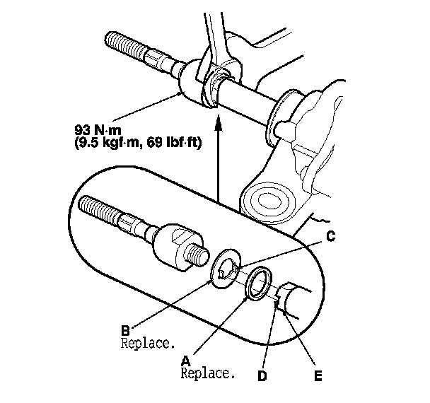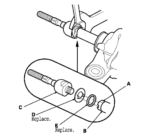 2. Install a new rubber stop (A) and a new lock washer (B). Align the lock washer tabs (C) with the slots (D) on the rack end (E) while holding the lock washer in place. Repeat this step for the other side of the rack.