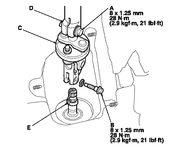 12. Loosen the upper steering joint bolt (A), and remove the lower steering joint bolt (B). Disconnect the steering joint (C) by moving the steering joint toward the column. Do not disconnect the steering joint from the column shaft (D).