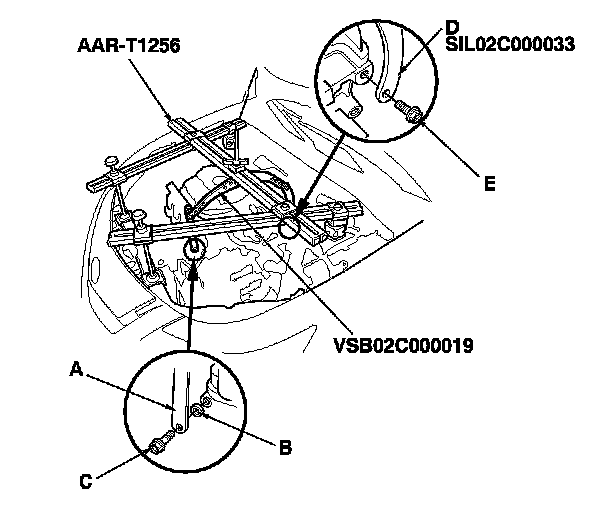 15. Lift and support the engine with the engine support hanger (AAR-T1256) and the engine hanger balance bar (VSB02C000019). Attach the front arm (A) to the front cylinder head with a spacer (B) and a 10 x 1.25 mm bolt (C). Remove the rear arm from the engine hanger balance bar, and install the 2008 V6 attachment arm (SIL02C000033), then attach the 2008 V6 attachment arm (D) to the rear cylinder head with a 8 x 1.25 mm bolt (E).
