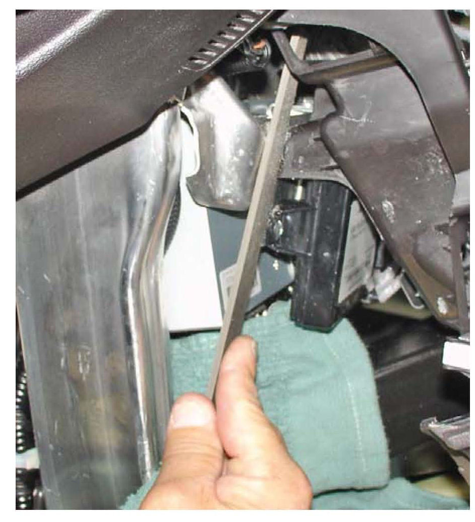 Place a shop towel inside the center console cavity, under the area you are filing, so that the metal filings do not fall on any harnesses or components.