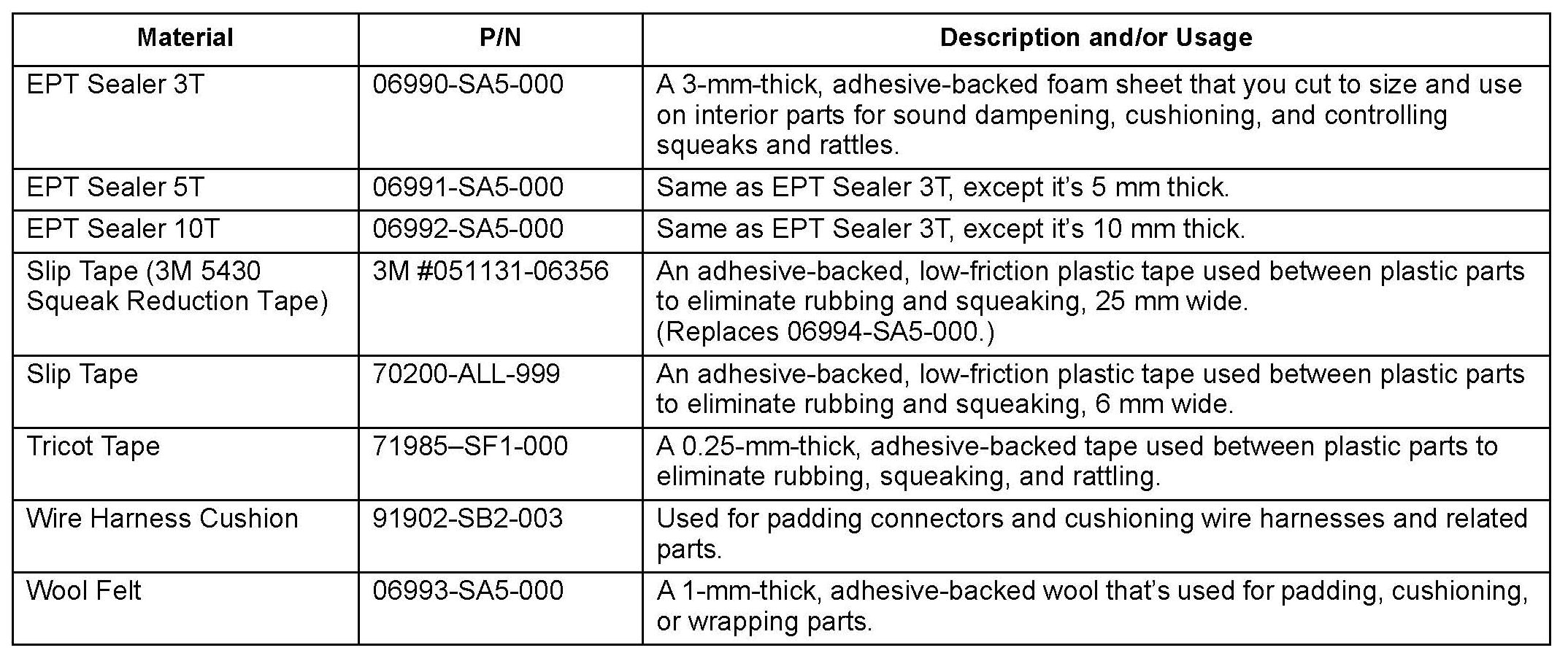 Many procedures in service bulletins and other service publications require you to use adhesives, sealants, lubricants, solvents, wool felt, EPT sealer, etc. While some of these materials look and feel similar to each other or to non-approved materials, always use the recommended material to save yourself a costly comeback and a dissatisfied client. Remember, a material that's "almost the same" probably wont do the job.