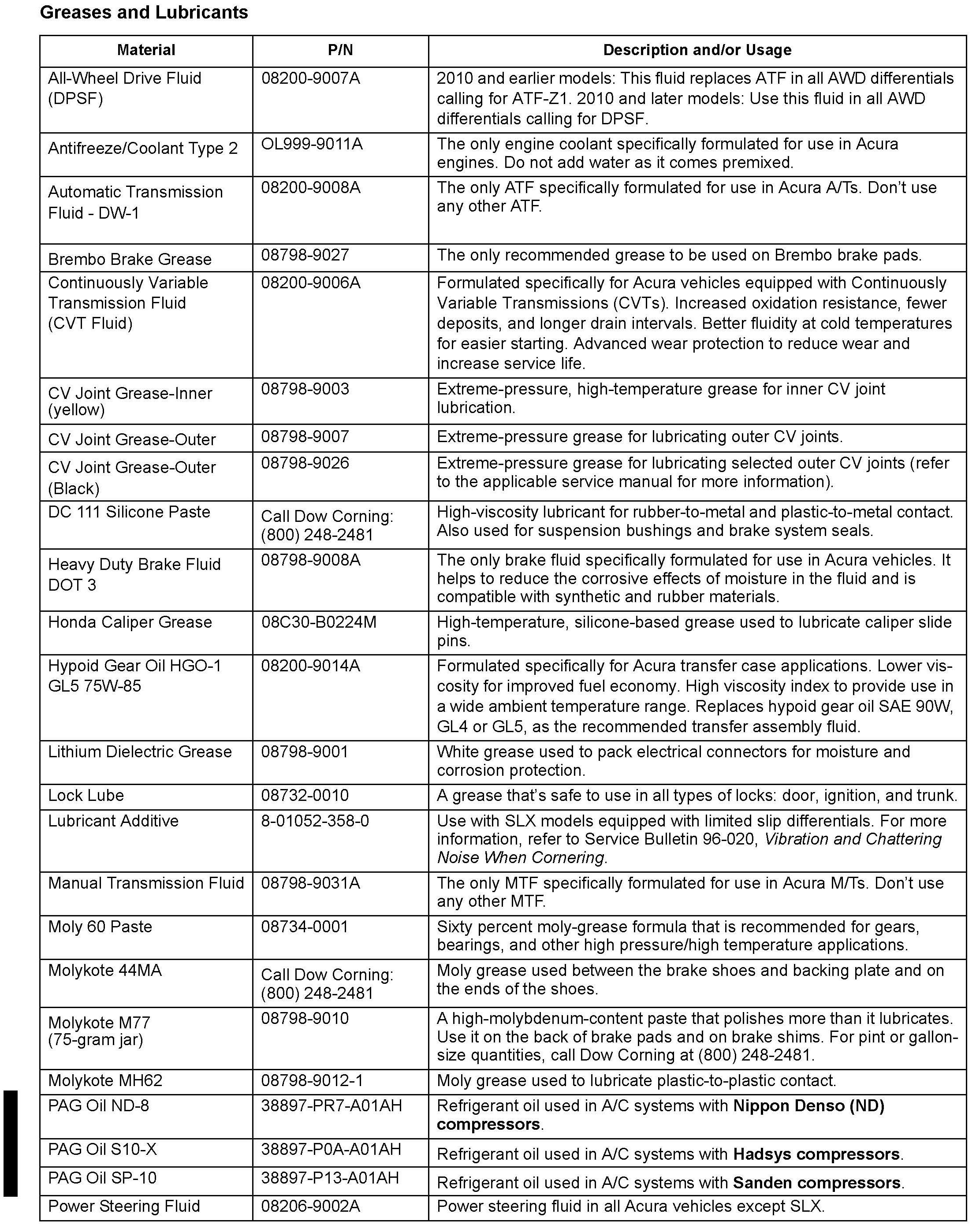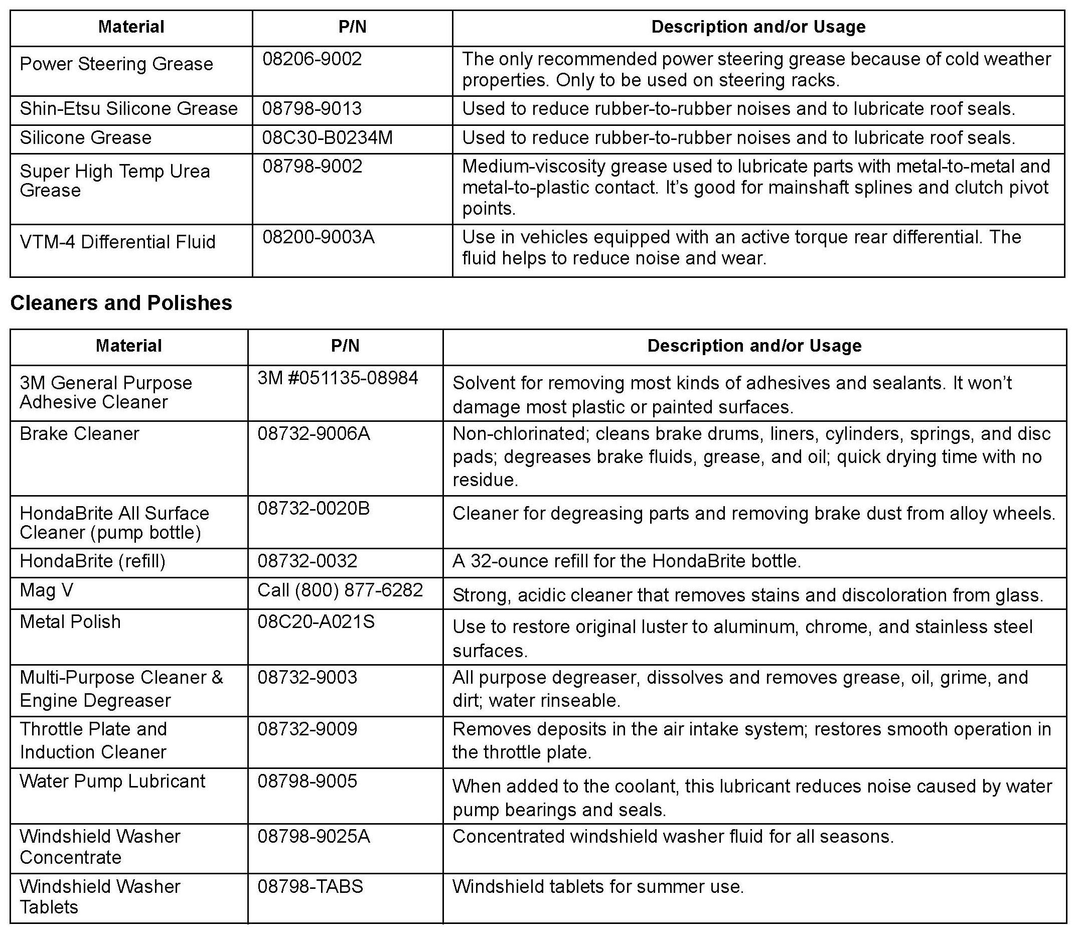 Greases and Lubricants, and Cleaners and Polishes. You can purchase these materials through local suppliers; many are also available through Acura. Please share the information in this bulletin with the people in your Parts department.