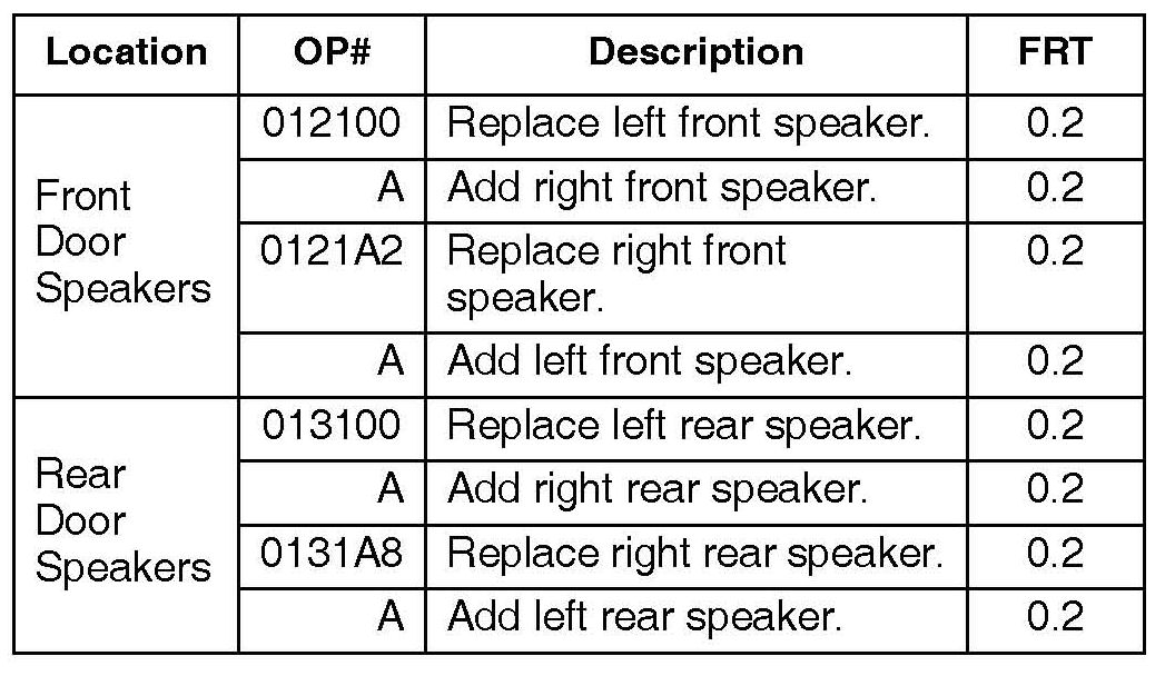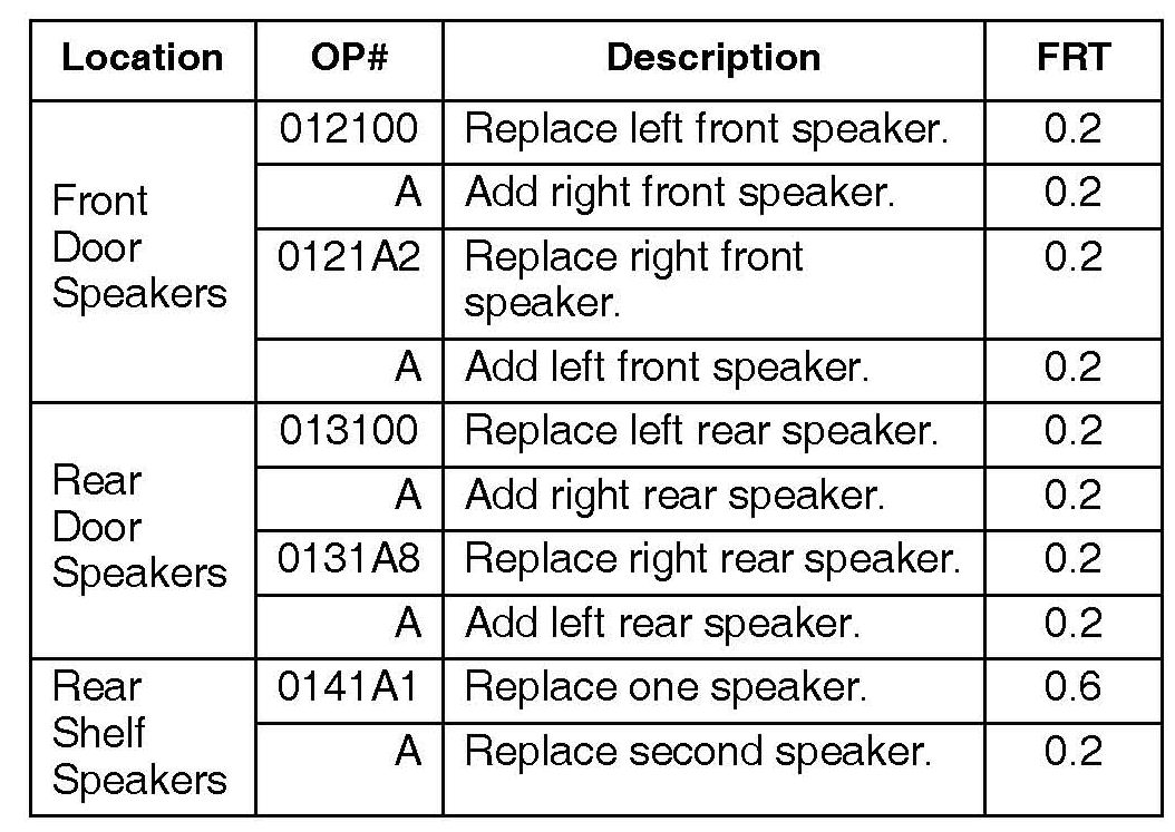 There are separate warranty numbers depending on which side of the vehicle you begin. For example, if you replace the left front speaker, then the right, use OP # 012100 and combo code A to file your warranty claim.