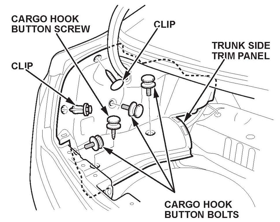 1. Open the trunk lid. Detach the clips and remove the cargo hook buttons, then remove the side trim panel from both sides.