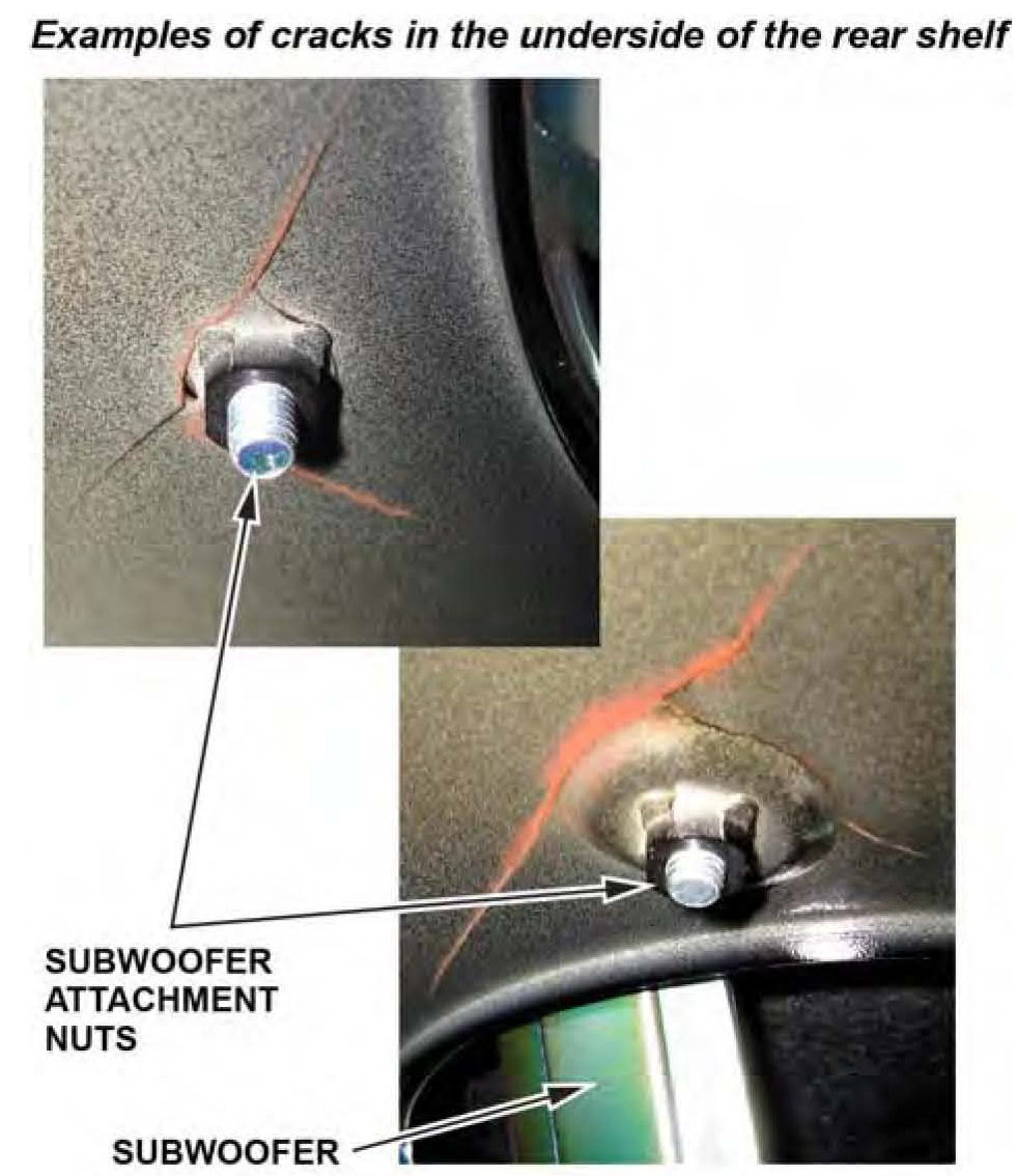 ^ If the rear shelf subwoofer attachment area does not have any cracks, this bulletin does not apply; continue with normal troubleshooting.