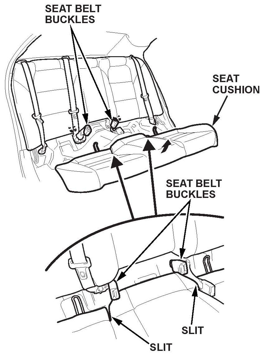 2. Remove the seat cushion, and release the center seat belt buckles from the slits.