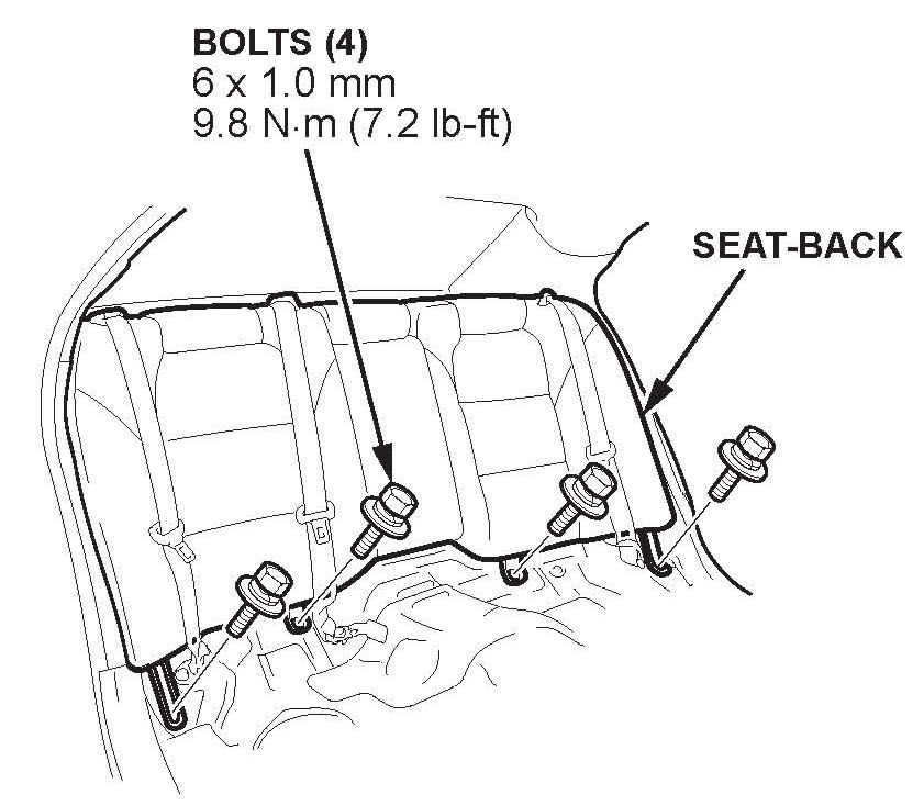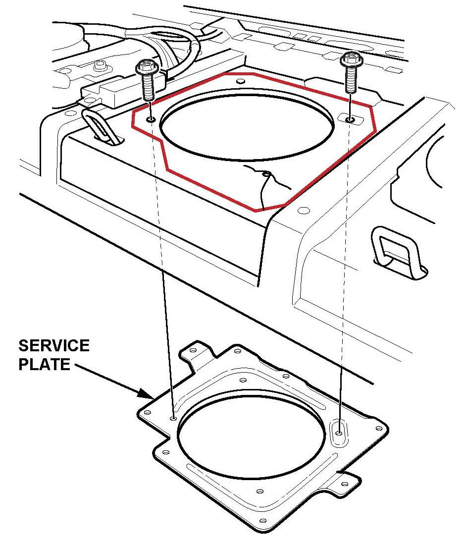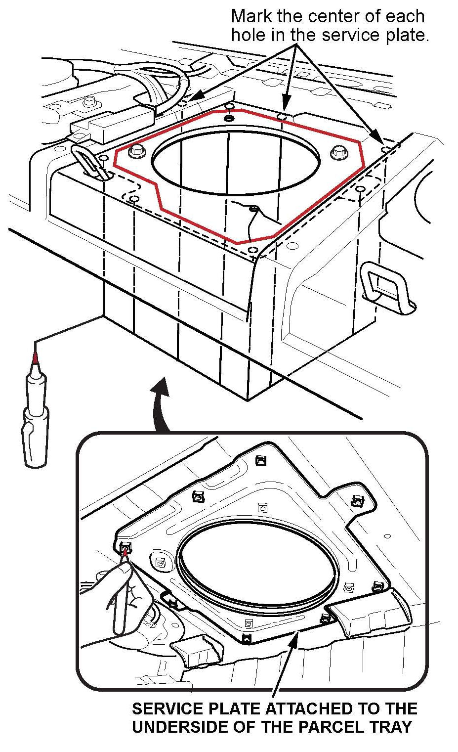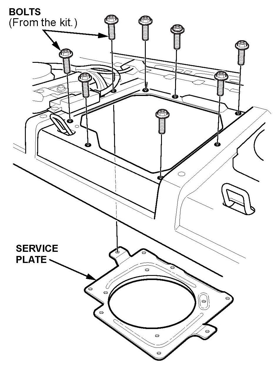 18. From inside the trunk, attach the service plate to the underside of the rear shelf using two bolts in a cross-diagonal location.