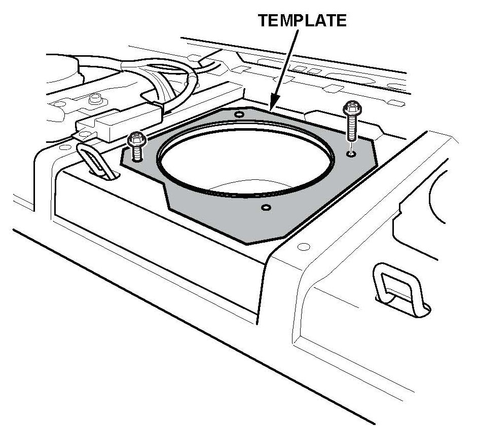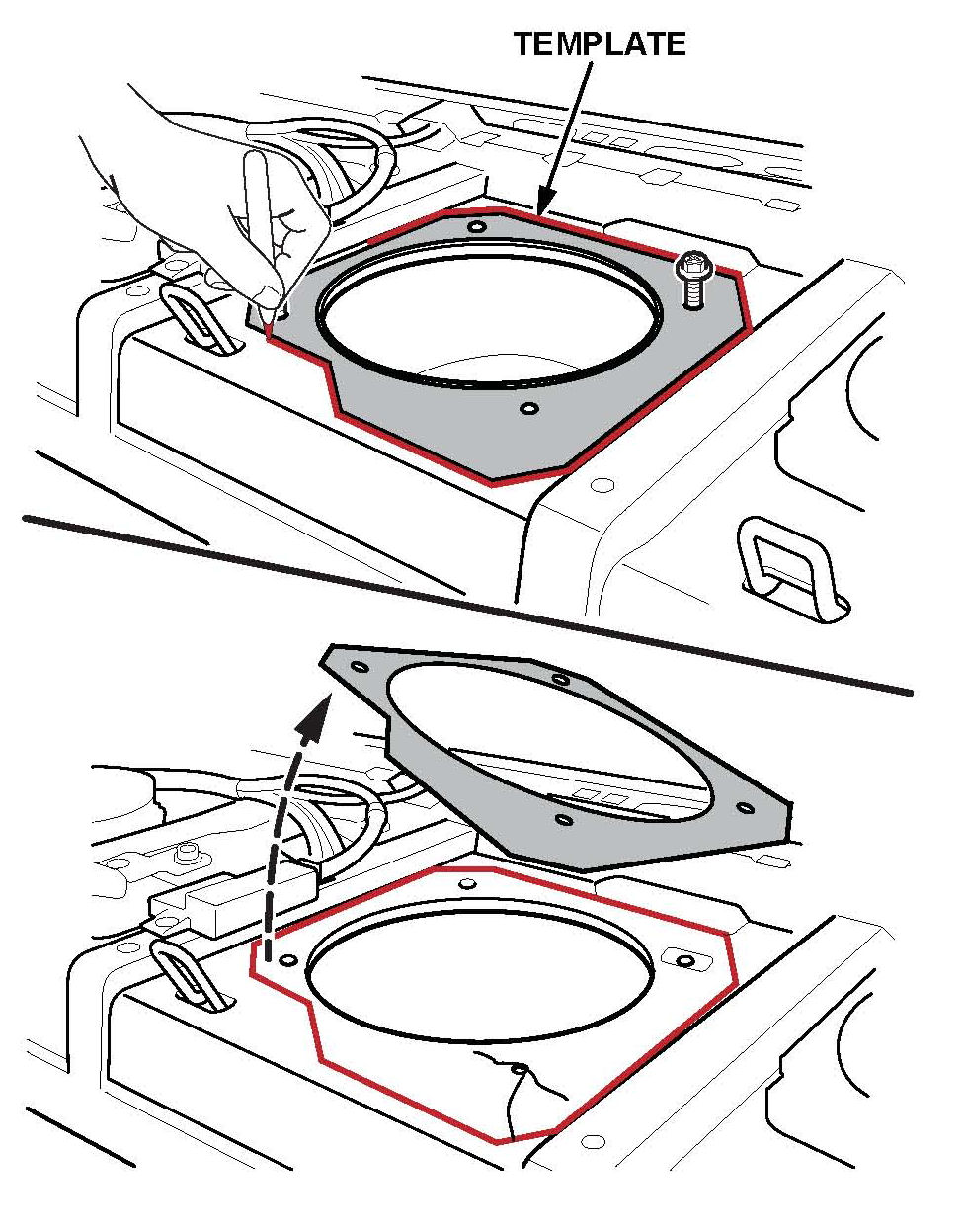 14. Cut out the paper template provided in the kit. Punch four holes in the template where the subwoofer mounting bolts go through.