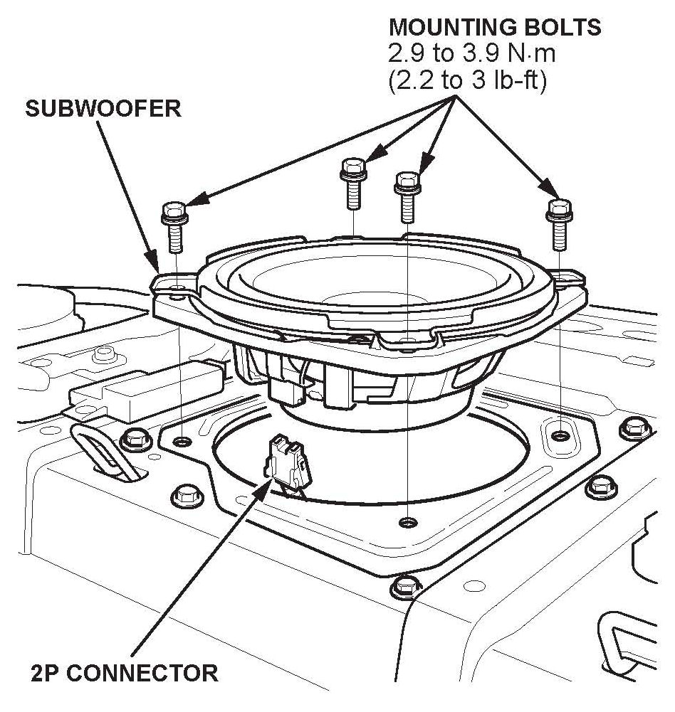 33. Install the subwoofer assembly to the new service plate and torque the bolts to 2.9 to 3.9 N.m (2.2 to 3 lb-ft)