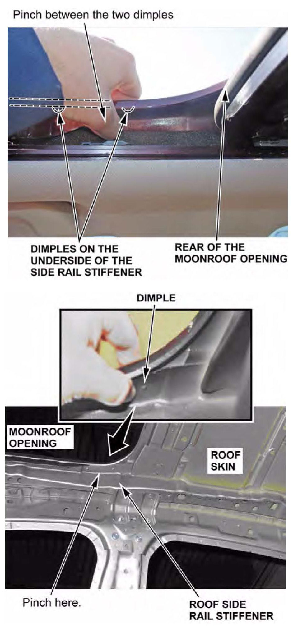 2. Continue test-driving, and pinch the roof side rail stiffener panel and the roof skin panel with your finger and thumb, at or near the dimple spot.