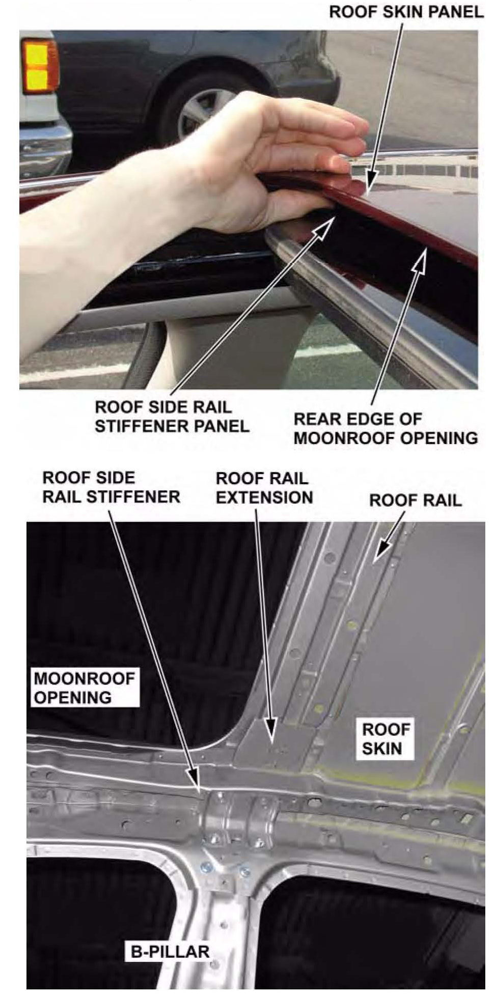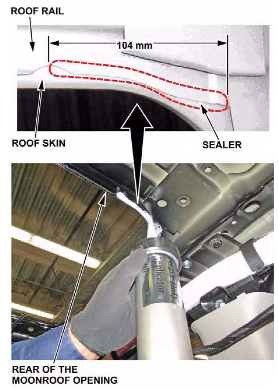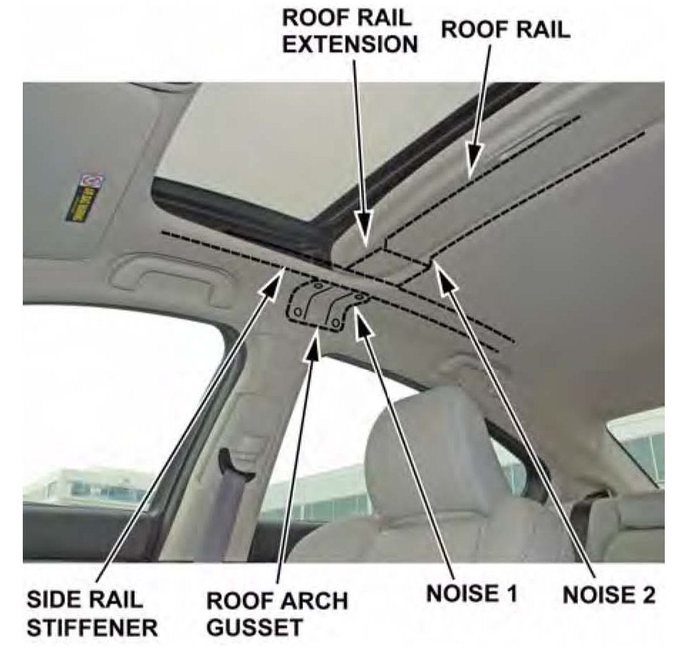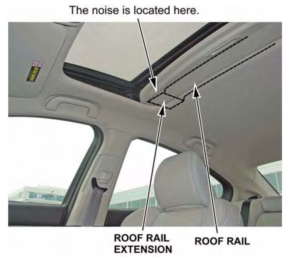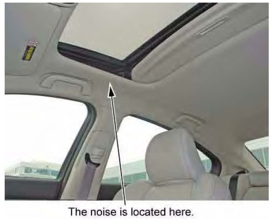 This repair addresses the noise located along the rearward edge and corner of the sunroof opening between the roof rail and the roof skin.