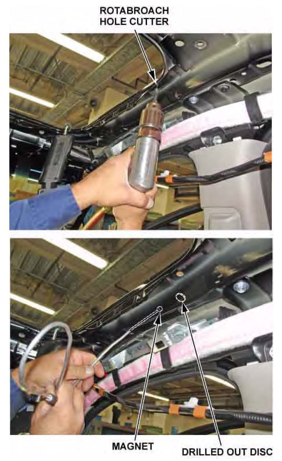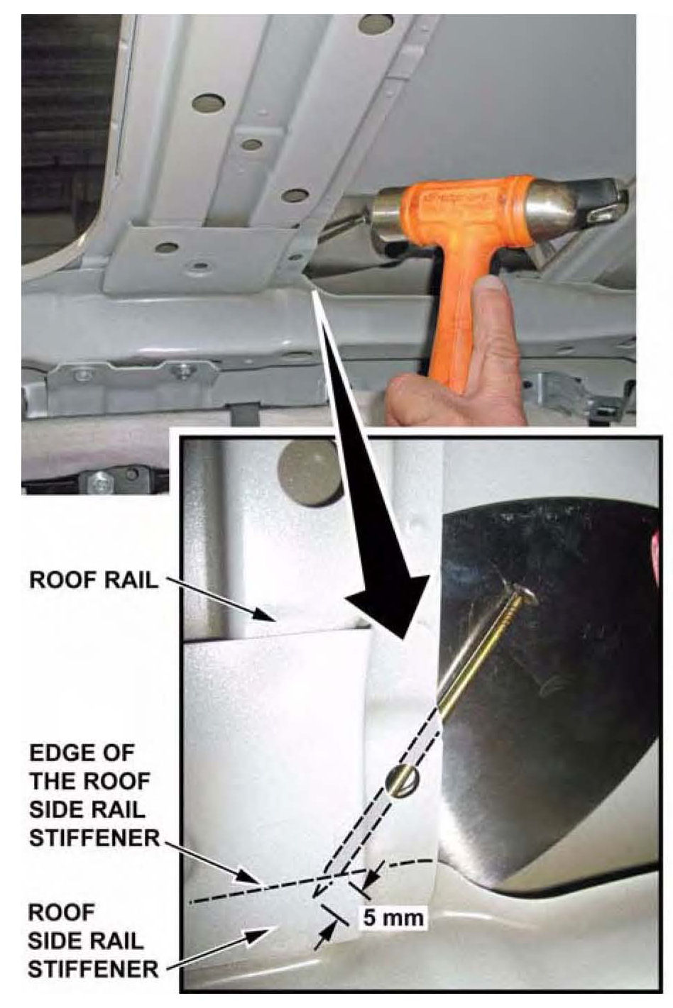 4. Use a 10 mm or 3/8 in. diameter Rotabroach Hole Cutter to drill a hole into the roof side rail stiffener, next to the most forward dimple spot. Do not drill deeper than 1 mm, or you may damage the roof skin.