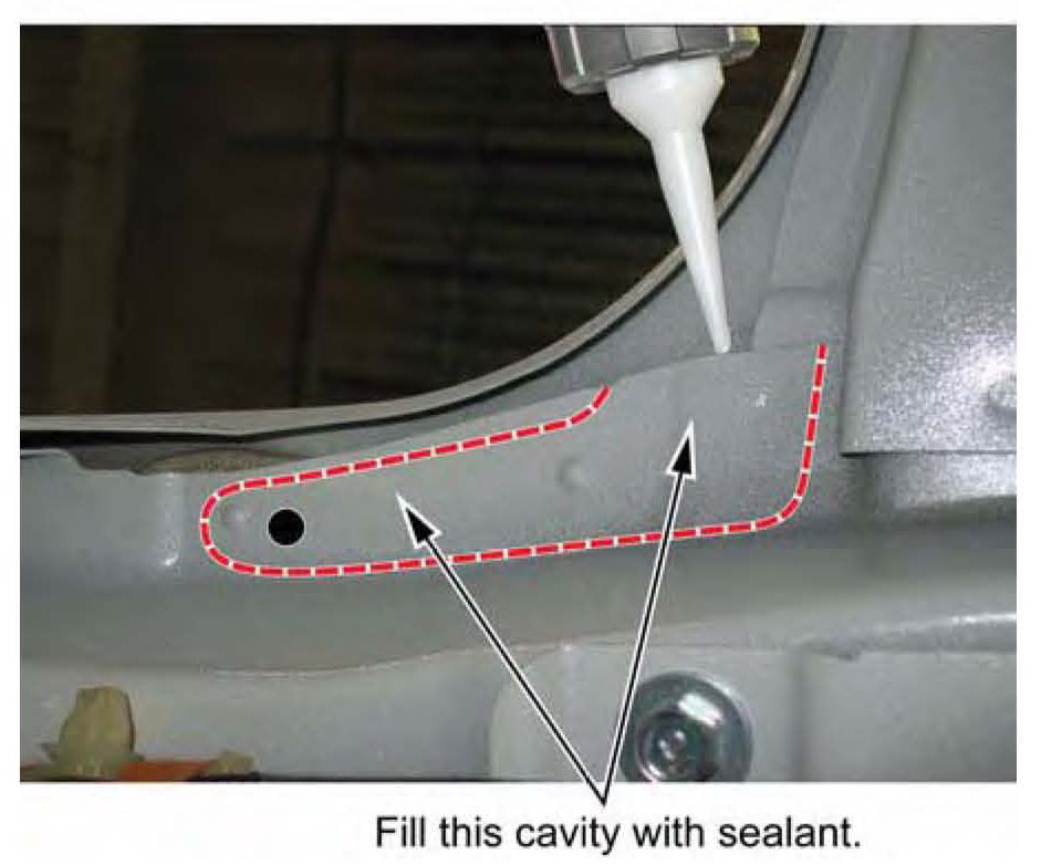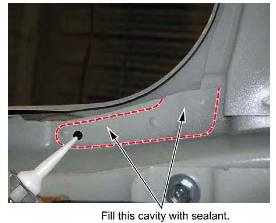 5. Add sealant into the hole that you drilled in the roof side rail stiffener and fill the cavity marked in red.