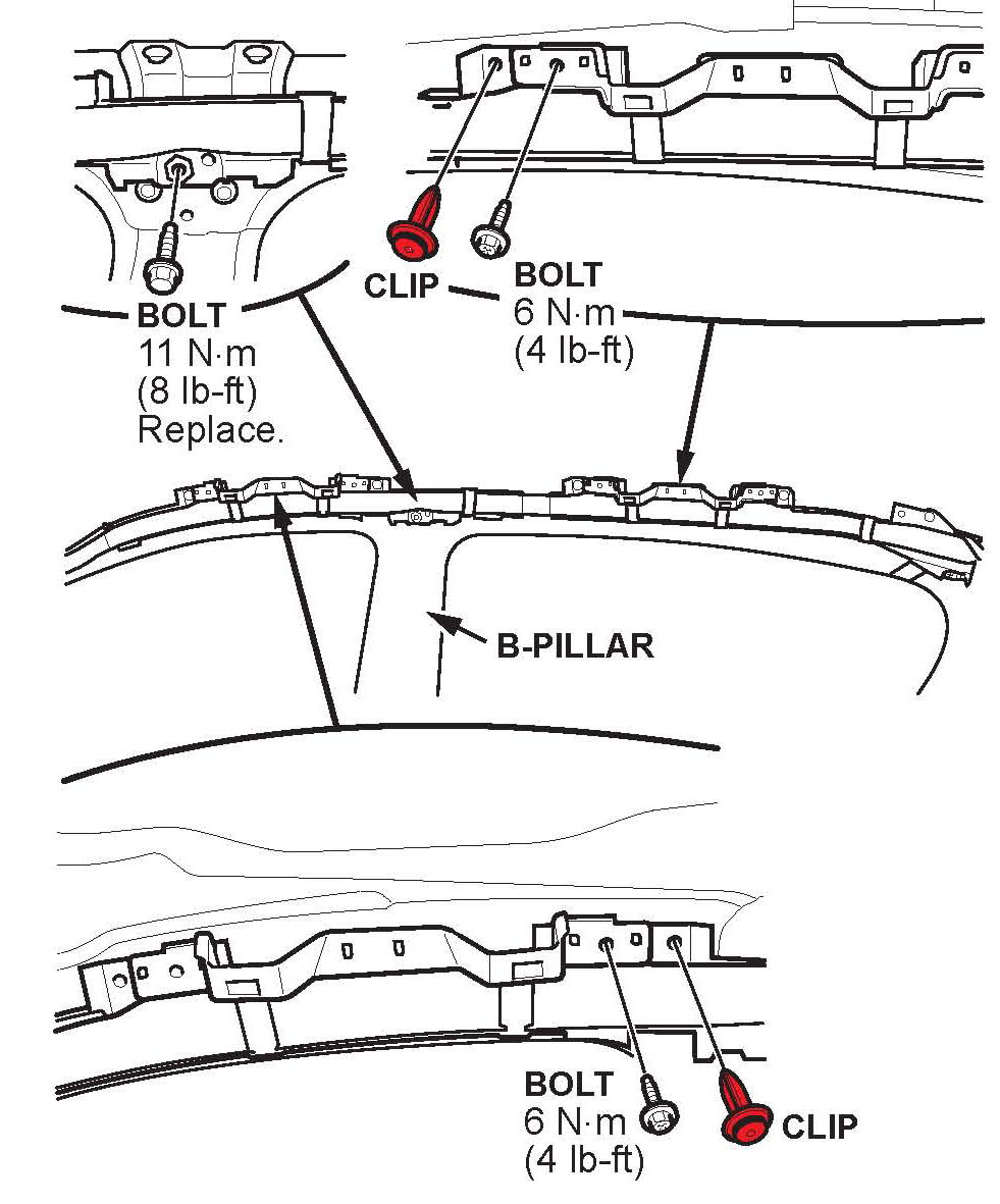 2. Remove the three bolts from the side curtain airbag, then remove the two red clips.