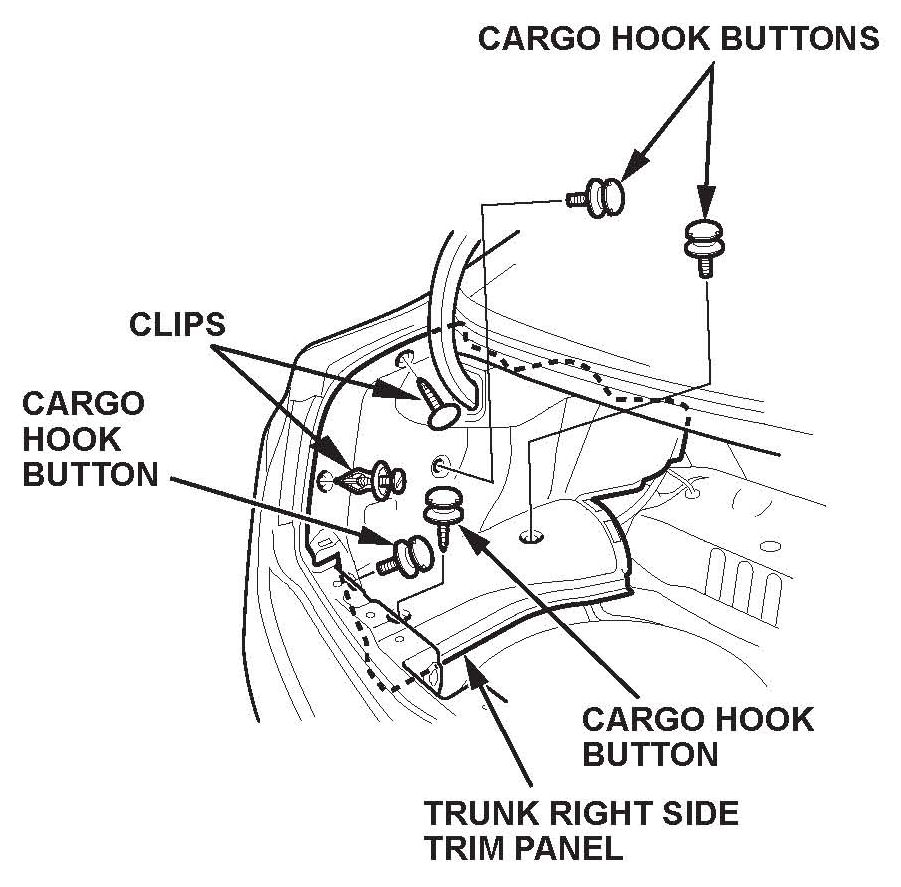 6. Detach the clips and remove the cargo hook buttons, then remove both of the trunk side trim panels.