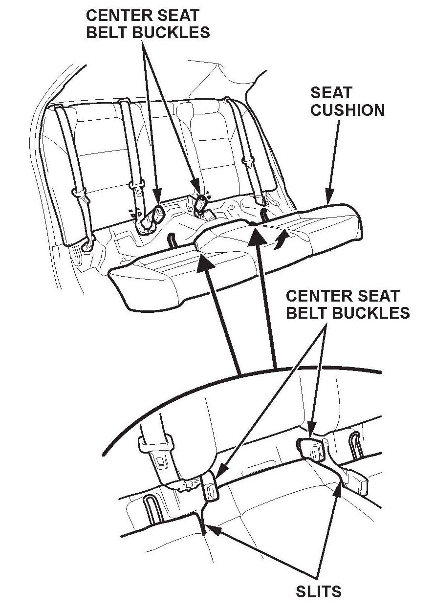 8. Remove the seat cushion, and release the center seat belt buckles from the slits.