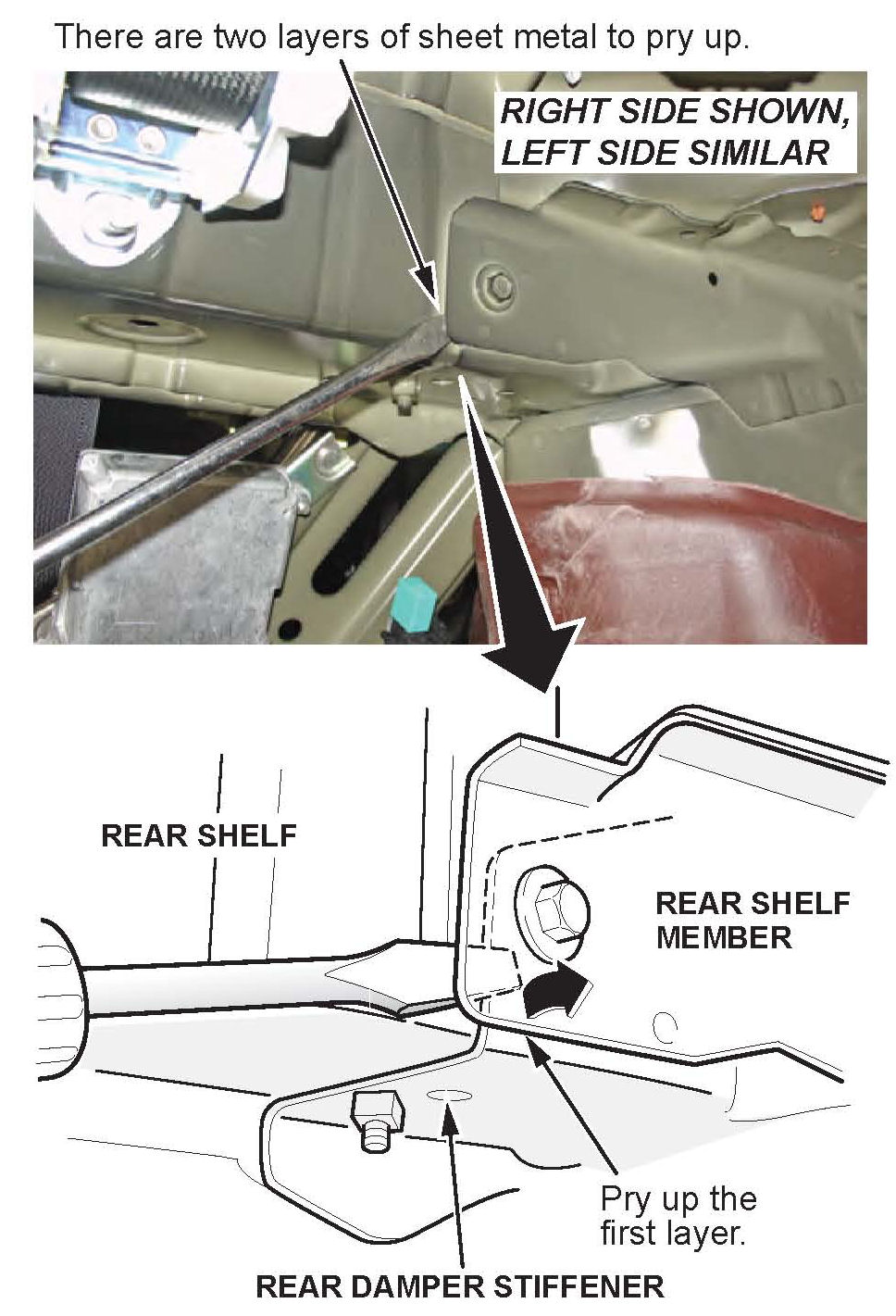 14. With the rear shelf bolt installed, place a flat tip screwdriver between the rear shelf member and the rear shelf metal panels. Create a gap to separate the panels. A hammer may be needed to get the screwdriver between the panels.