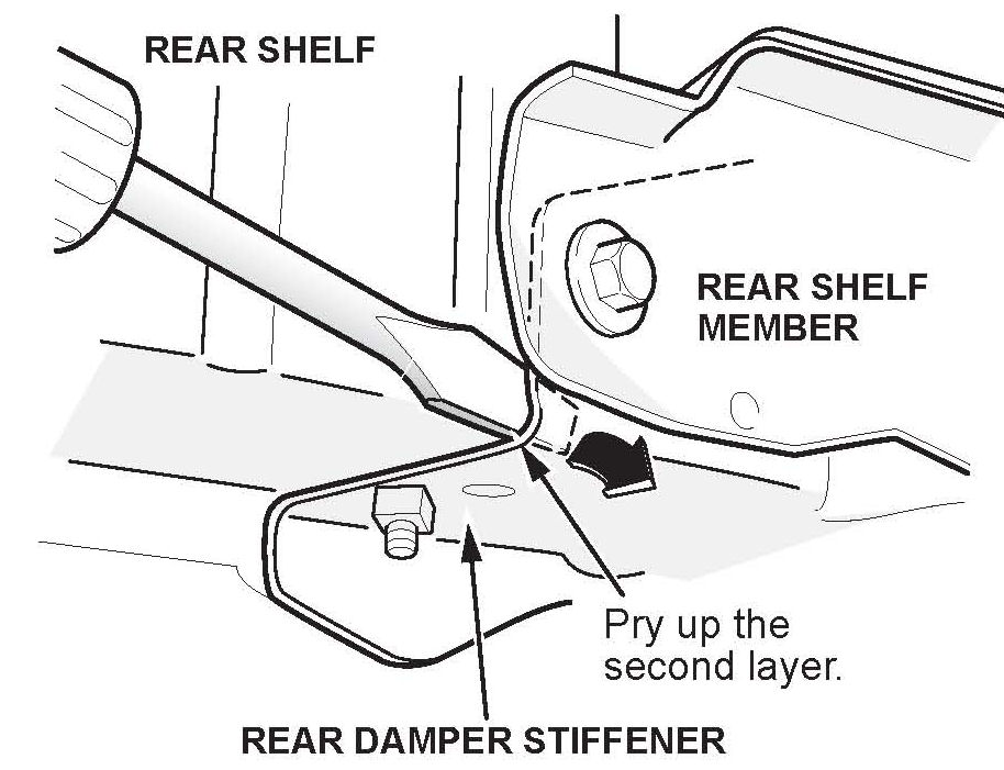 15. Place a flat tip screwdriver in between the rear damper stiffener and the rear shelf metal panels. Create a gap to separate the panels.