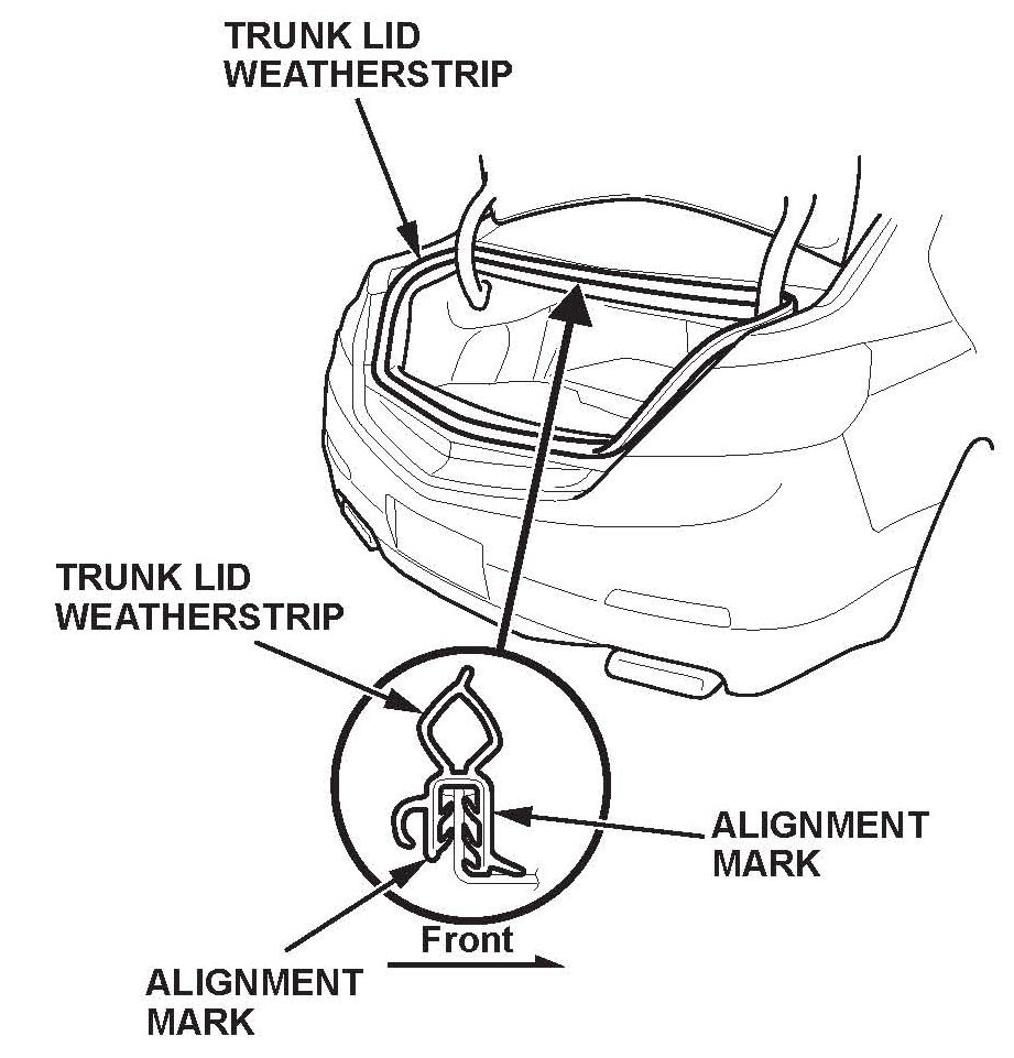 Locate the painted alignment mark on the trunk lid weatherstrip. Align the painted mark in the center of the trunk lid opening, and install the trunk lid weatherstrip all the way around in the direction shown. Make sure there are no wrinkles in the weatherstrip.