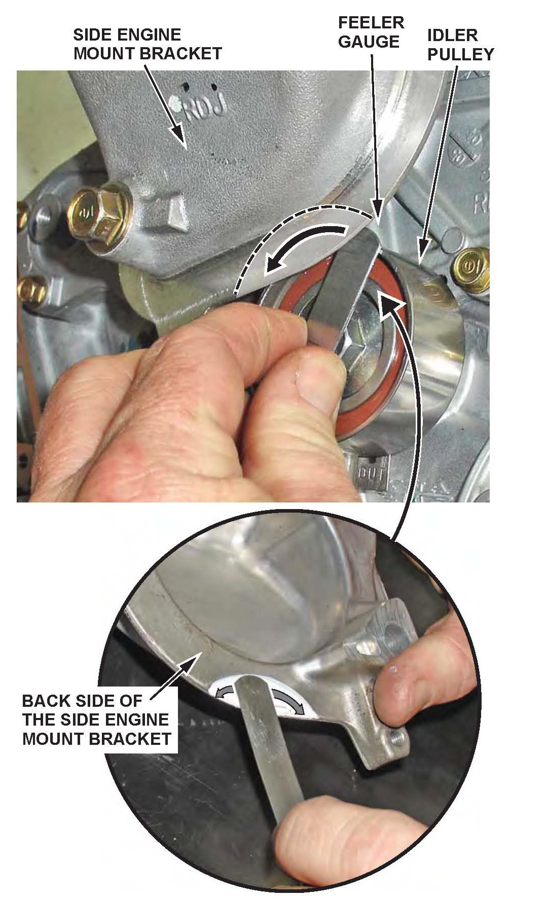 5. Try to insert a 0.95 mm feeler gauge between the top edge of the timing belt idler pulley and the back of the side engine mount bracket overhanging the pulley. This measurement is used to determine if step 12 is required.