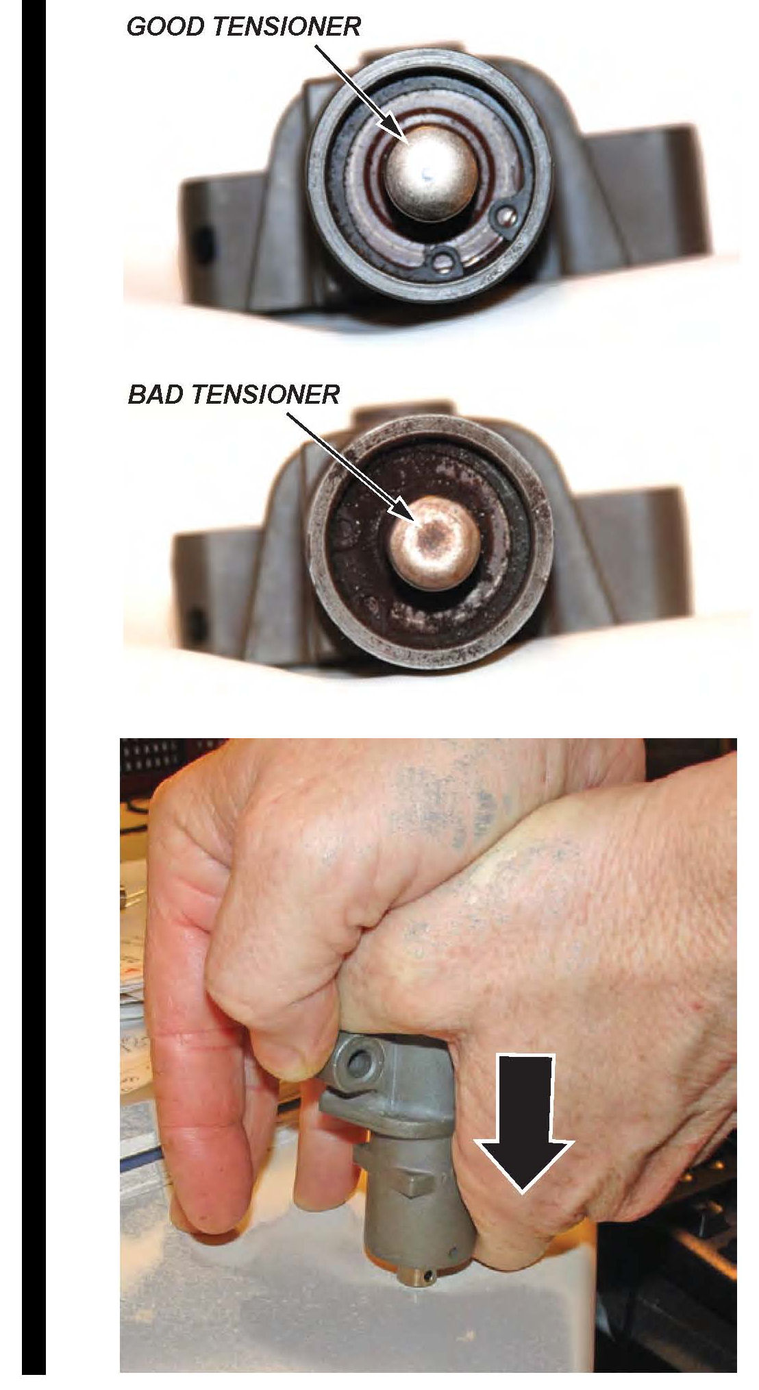 Remove the timing belt auto-tensioner, and inspect the tip of the piston for signs of damage. Test the tensioner by pushing it down against a flat surface. The tensioner should not compress. Replace it if it is damaged or if it compresses.